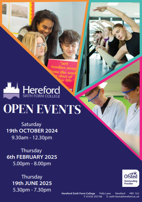 Hereford Sixth Form College Open Evening - 6th February 5-8pm, register at https://www.hereford.ac.uk/news-and-events/events/february-2025-open-event/